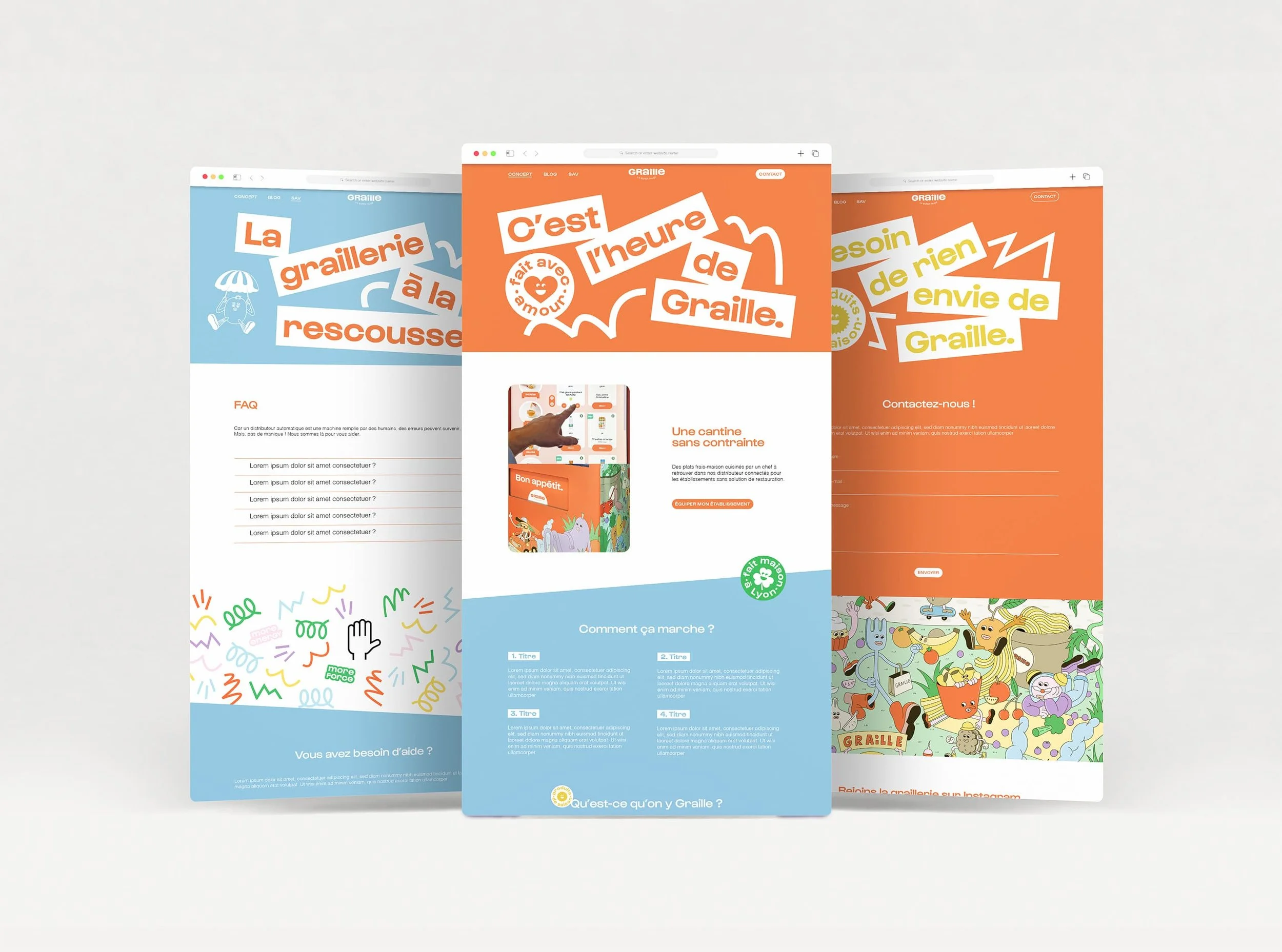 Le site web de Graille est l’une des premières vitrines de leur univers. J’ai donc pris soin d’y retranscrire l’ensemble des codes graphiques de la marque : palette vitaminée, typographies expressives, pictos dessinés à la main, jeux de mise en page dynamiques…