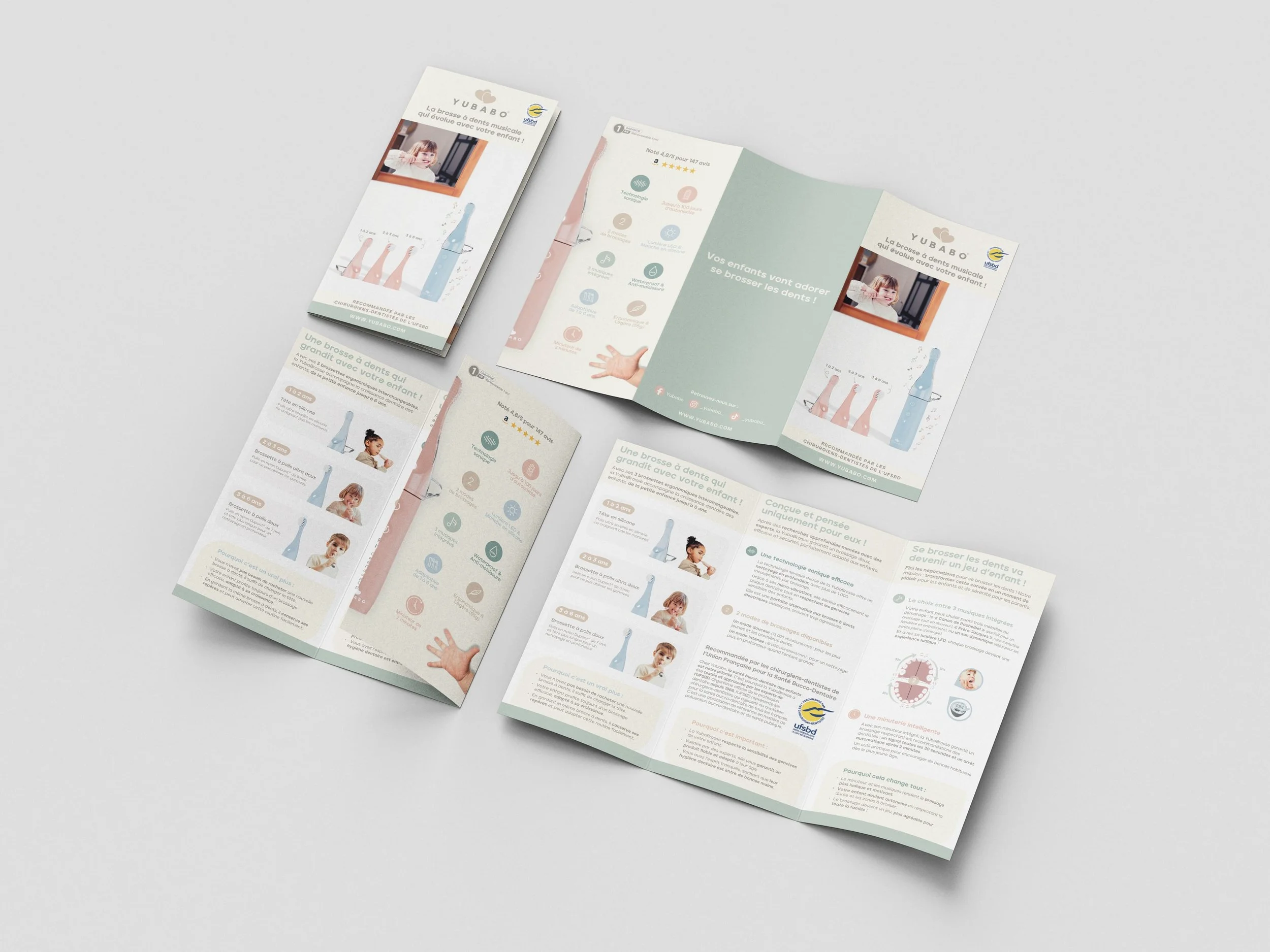 Ce dépliant 3 volets, pensé pour le B2C, met en avant les bénéfices concrets du produit pour les parents et les enfants, avec un message clair et impactant.